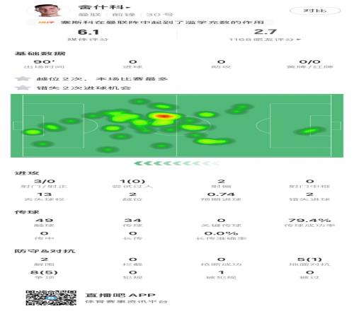 本场舍什科错失两次进球机会、3次射门0次射正,丢失13次球权。
