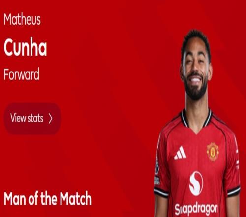 打入扳平进球,官方:库尼亚当选曼联11利兹联全场最佳球员