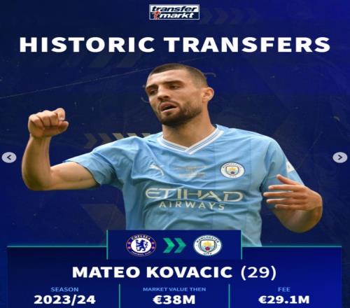 科瓦西奇(29岁):切尔西→曼城,23-24赛季,身价3800万,转会费2910万