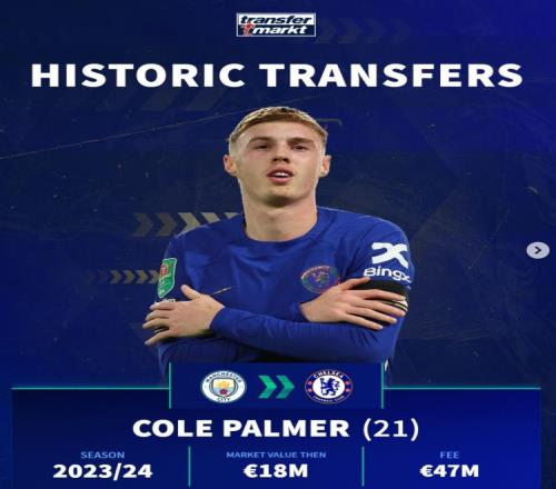 帕尔默(21岁):曼城→切尔西,23-24赛季,身价1800万,转会费4700万