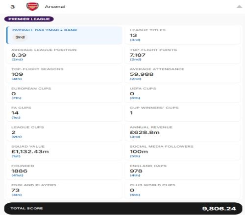 17项数据分别为:赢得的联赛冠军、历史平均联赛排名(英冠第一名算作第21名,英甲第一名算作第45名,以此类推)、顶级联赛总积分、顶级联赛赛季总数、过去10个赛季的平均上座率、赢得的欧洲冠军杯(包括欧冠联赛)、赢得的欧洲联盟杯(包括欧联杯)、赢得的足总杯、赢得的欧洲优胜者杯、赢得的联赛杯、年度收入、球队价值、社交媒体粉丝数(Facebook、X和Instagram)、成立日期、球员为该俱乐部效力时获得的英格兰队出场次数、在该俱乐部效力的英格兰国脚人数以及赢得的世俱杯。