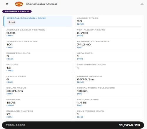 17项数据及其排名:联赛冠军20(1),平均联赛排名7.83(1),顶级联赛积分7361(1),顶级联赛赛季111(3),平均上座人数52325(6),欧冠冠军6(1),欧联杯冠军3(1),足总杯冠军8(3),欧洲优胜者杯冠军0,联赛杯冠军10(1),营收6.272亿镑(4),球队身价9.135亿镑(4),社媒粉丝1.31亿(2),创立时间1892(55),英格兰出场数1210(2),英格兰代表队人数75(3),世俱杯冠军1(2)