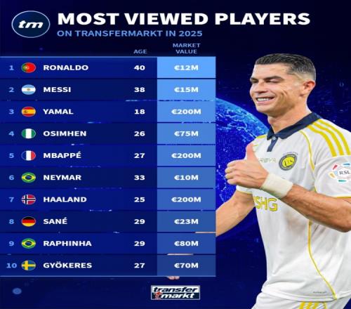 2025年德转球员信息浏览量排名:C罗居首,梅西、亚马尔二三位