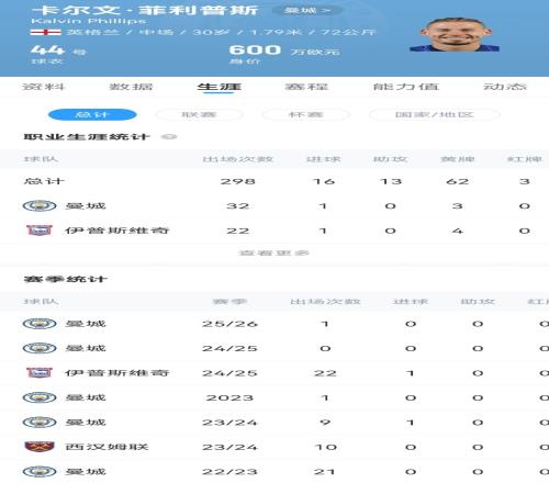 2022年夏天,曼城花费4900万欧从利兹联引进菲利普斯,当时球员的身价高达5000万欧。但在瓜帅手下,菲利普斯并没有多少出场机会,在曼城的第一个赛季他代表球队出战21场,0球0助攻,仅4次首发。