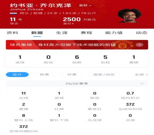 齐尔克泽现年24岁,他本赛季为曼联出场11次,打入1球,出场总时间仅372分钟。