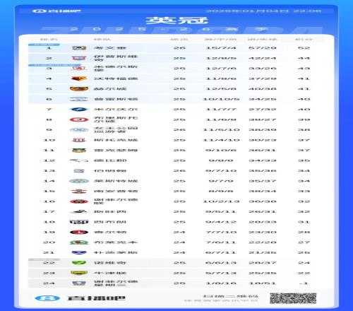 而半程第二的米德尔斯堡则近4轮1平3负,已掉至第3,今晚将对阵南安普顿。