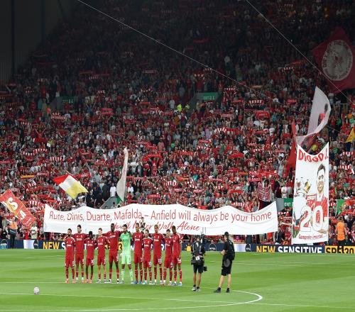 图为英超首轮利物浦在对阵伯恩茅斯赛前悼念若塔