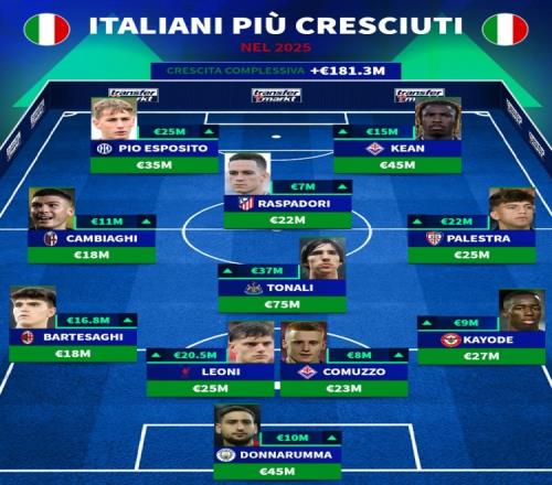 2025年意大利球员身价上涨阵容:多纳鲁马、托纳利、小基恩在列