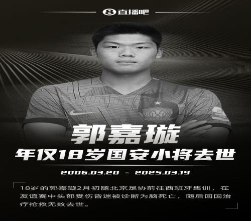 年初,国安青训小将郭嘉璇在拉练遭遇不测,一次对抗导致他遭遇严重伤情。虽然给出了救治,然而伤势过重回国治疗仍没有能让奇迹发生。