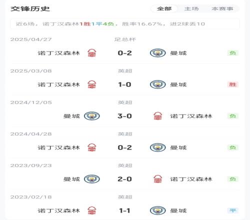 目前英超积分榜上,曼城12胜1平4负积37分,位列第2;诺丁汉森林5胜3平9负积18分,位列第17。