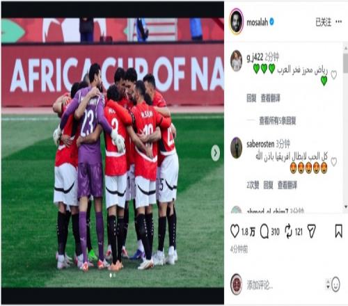 萨拉赫更新社媒动态,晒出埃及球员们在球场上搭肩拥抱、围成一圈的照片,庆祝球队晋级淘汰赛。