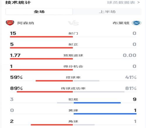 压制!阿森纳半场10布莱顿:射门150,射正50,控球率59%41%