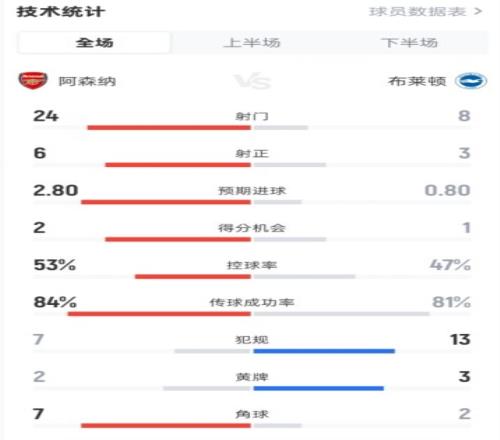 阿森纳21布莱顿全场数据:射门248,射正63,控球率53%47%
