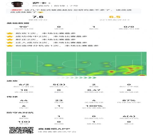 萨卡本场6射2正1助攻+4关键传球5过人3成功+6传中2成功获7.6分