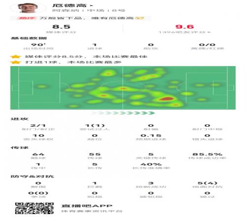 厄德高本场1球+5关键传球3抢断+5对抗4成功获评8.5分全场最高