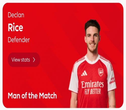 客串右后卫收获MVP!官方:赖斯当选阿森纳21布莱顿的全场最佳