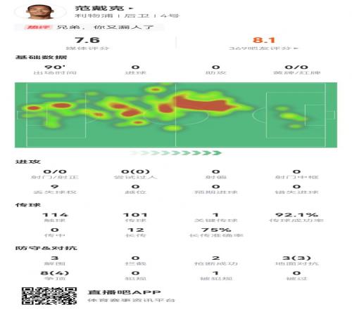 范戴克本场1造犯规+3解围2抢断12长传9成功+11对抗7成功获7.6分