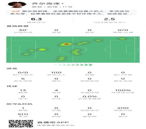 此役齐尔克泽在30分钟里触球13次,5次丢球权,没有射门,过人1次失败。对抗方面他合计7次对抗只成功1次。大部分数据挂零的情况下,他传球4次100%成功率和1次解围算为数不多的亮点。