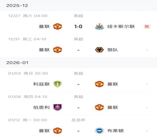 15!曼联蓄发哥憧憬5连胜:后4场踢狼队利兹联伯恩利布莱顿