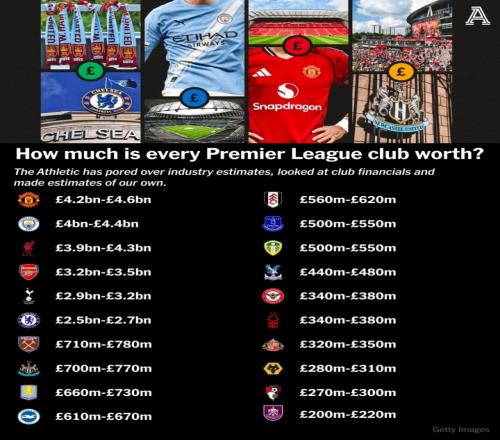 体育播报12月27日宣 著名媒体《The Athletic》仔细研究了行业估算,查看了俱乐部最近的财务状况,并汇总了相关数据。包括TA在内,加上Football Benchmark、福布斯、Kinnaird和Sportico的估计数值汇总,他们给出了英超20队的价值区间。
