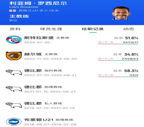 41岁的罗西尼尔球员生涯曾效力布莱顿、赫尔城、富勒姆等球队,2024年夏天成为斯特拉斯堡主帅并执教至今。他曾是鲁尼在德比郡的助教。