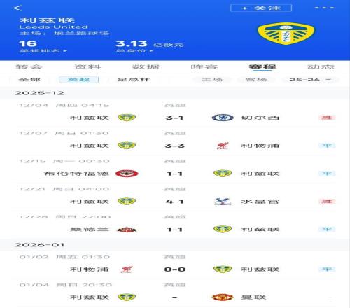 体育播报01月02日宣 英超第19轮,利兹联0-0战平利物浦,短时间内2次战平红军,取得2分。
