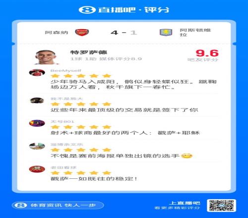 在阿森纳4-1维拉的比赛中,特罗萨德一传一射,帮助阿森纳终结维拉队史最长的11连胜,并且扩大榜首领先优势。特罗萨德获得吧友近5万票支持,当选【体育播报X咪咕体育英超第19轮最佳球员】!