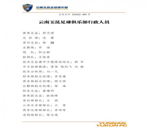云南玉昆足球俱乐部行政人员公布!