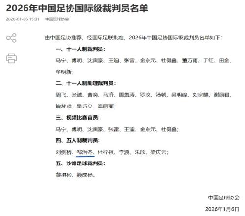 昨天,中国足协公布了2026年国际级裁判员名单。浙江省裁判员邹治冬成功入选五人制足球国际级裁判员序列。这是他自2018年成为浙江历史上首位五人制国际级裁判以来,其专业资质与国际水平的持续认可。