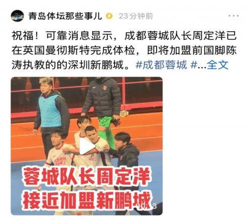 记者透露:可靠消息显示,成都蓉城队长周定洋已在英国曼彻斯特完成体检,即将加盟前国脚陈涛执教的深圳新鹏城。