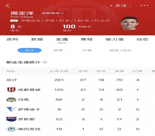 周定洋即将迎来32岁生日,他与成都蓉城的合同1月31日即将到期。2022年加盟至今,周定洋代表成都蓉城出战了125场比赛,率队完成闯入亚冠精英联赛的壮举。