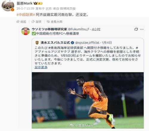 关于阿齐兹与河南队的接触情况,苗原援引了外媒的报道截图并透露写道:“阿齐兹确实跟河南在聊,还没定。”