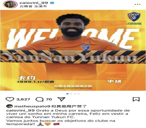 卡约社媒谈加盟云南玉昆:让我们一起在本赛季追寻俱乐部的目标吧