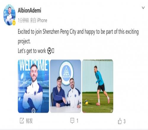 在个人微博,阿代米晒出签约图以及训练图,他同时配文:很高兴加盟深圳新鹏城,并成为这个令人兴奋的项目的一部分,让我们开始工作吧。