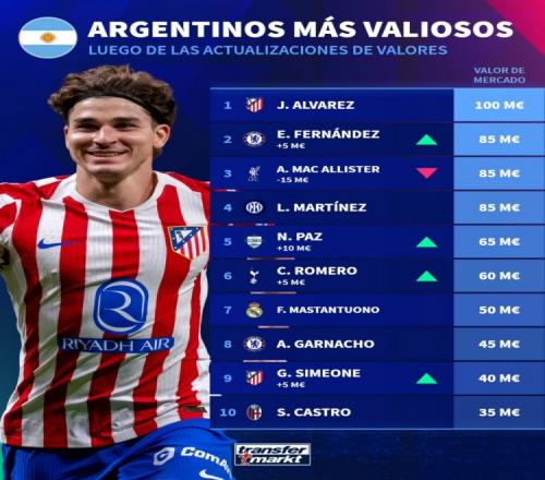 阿根廷球员身价:小蜘蛛1亿欧居首,恩佐、麦卡、劳塔罗8500万欧