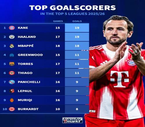 本赛季五大联赛射手榜:凯恩、哈兰德19球居首,姆巴佩18球